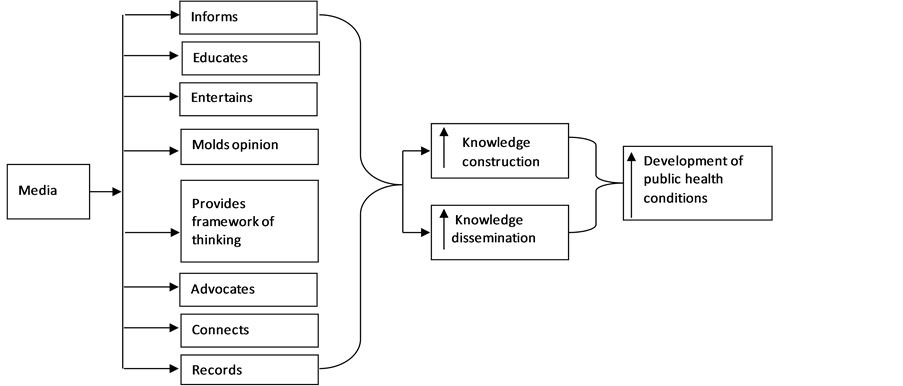 Media has seven interconnected functions: to inform, educate, entertain, mold opinion, provide a framework of thinking, make or establish connections between people, events, places and ideas and record events [38] . The information disseminated during educational programs, on news and/or news analyses and entertainment, helps to shape the opinions of people. When media inform the public, this provides data for people to analyze. This helps them construct knowledge and helps them ask themselves and others critical questions and this allows them to enlarge their choices in life. When media educates, it transmits proven knowledge and valid logic or best practices. Information delivered in the form of entertainment helps people to relax and manage their stress, heal faster and overcome depression. Also, information delivered in the form of entertainment can educate people.