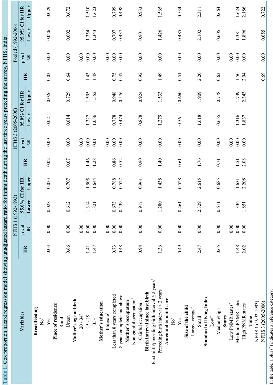 Table 1.Cox proportion hazard regression model showing unadjusted hazard ratio for infant death during the last three years preceding the survey,NFHS,India.