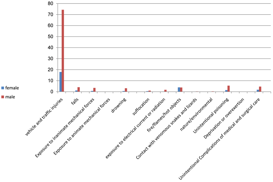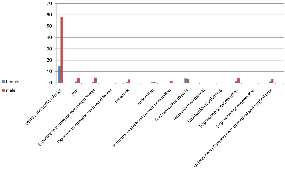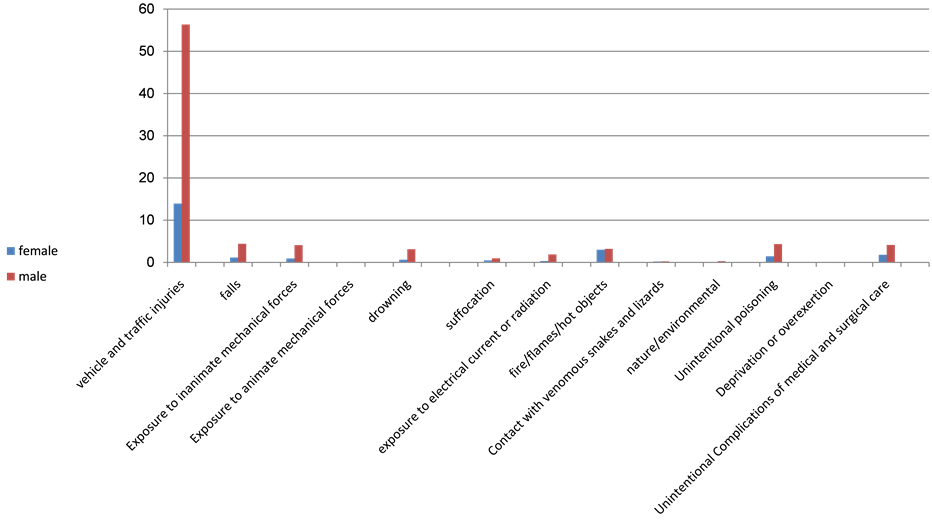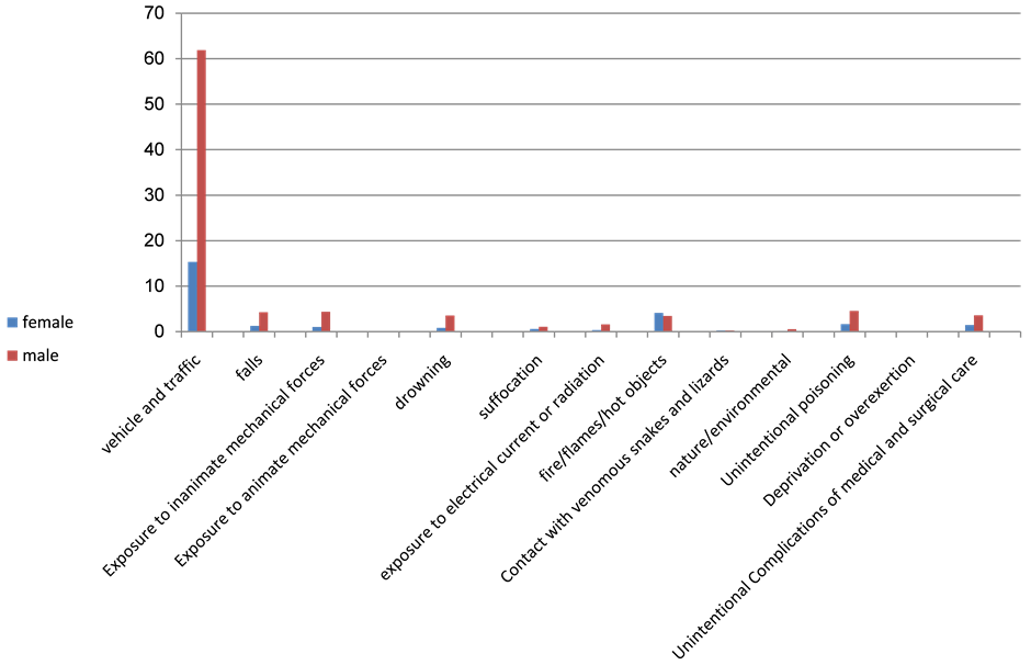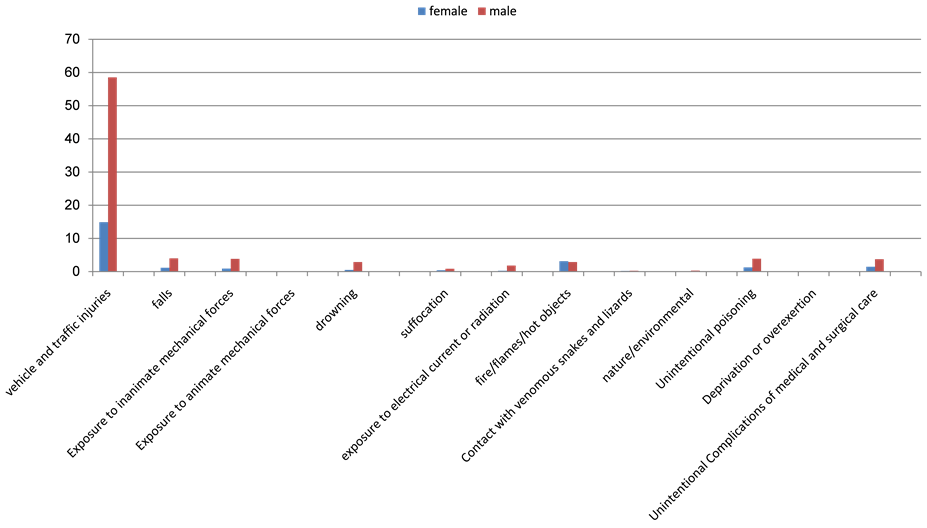 The proportion of deaths due to accidents out of total number of deaths due to unintentional injuries was 69.9% in 2006, 66.3% in 2007, 66.3% in 2008, 68.2 in 2009 and 65.5% in 2010. As shown in Table 3, the highest proportion of deaths due to accidents was in 2006.