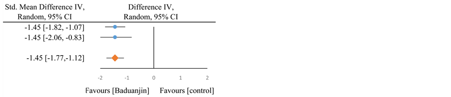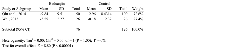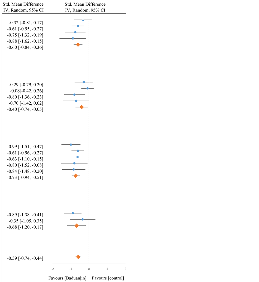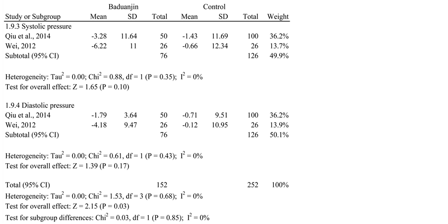 Figure 6. A forest plot of the meta-analysis of RCTs comparing Taiji softball with control group for change in systolic and diastolic pressures.