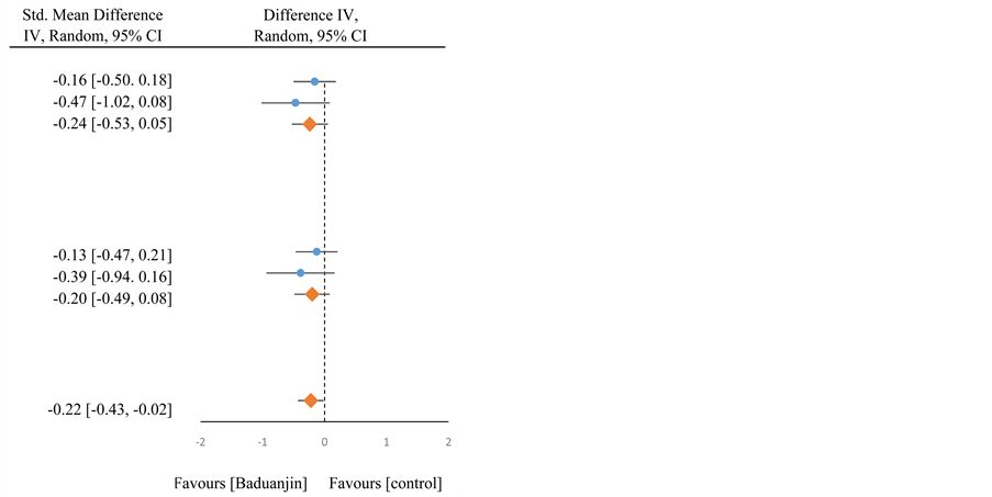 Two RCTs (a total of participants = 202) reported systolic pressure [33] [37] . Meta-analyses were performed to compare the Taichi softball program with non-intervention controls [33] , and routine drug treatment [37] . The overall results of these studies suggest that Taichi softball is associated with significantly decreased systolic pressure (SMD = −0.24, 95% CI [−0.53, −0.05], P value of 0.35 for heterogeneity with I2 = 0%, P value of test for overall effect = 0.10; Figure 6). Two RCTs (a total of participants = 202) reported diastolic pressure [33] [37] . Meta-analyses were performed to compare the Taichi softball program with non-intervention controls [31] , and routine drug treatment [37] . The overall results of these studies suggest that Taichi softball is associated with significantly decreased diastolic pressure (SMD = −0.20, 95% CI [−0.49, −0.08], P value of 0.43 for heterogeneity with I2 = 0%, P value of test for overall effect = 0.17; Figure 6).