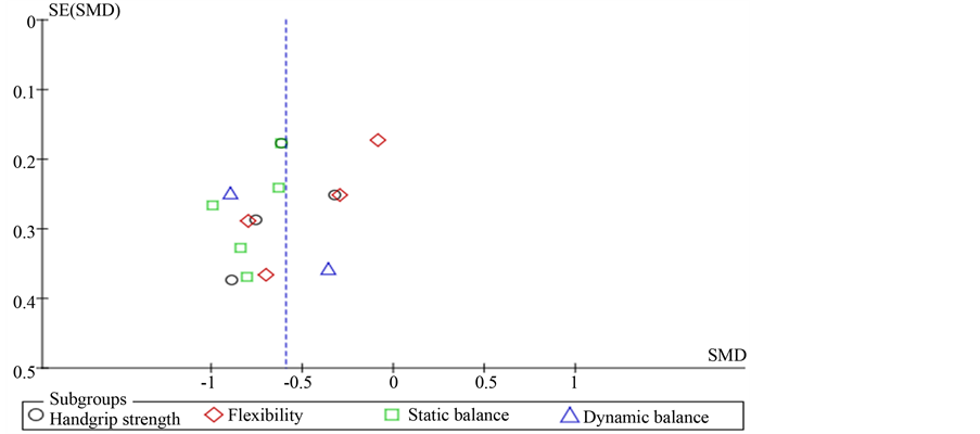 Figure 7. A Funnel plot for handgrip strength, trunk flexibility, static balance, and dynamic balance.