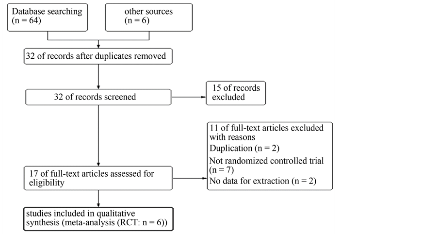 process and study selection). A total of 70 titles were identified using the following databases: PubMed (n = 2), Google Scholar (n = 19), Chinese National Knowledge Infrastructure (n =15), Chinese Scientific Journal Database (n = 16), Chinese Biomedical Literature Database (n = 12), and other sources (n = 6). After removing 38 duplicates, 32 articles were screened. 15 article were excluded based on two reasons (no relevance = 10; not a full text article = 5). Full texts of 17 articles were retrieved, and 11 articles were excluded with the following reasons: no components of the physical health reported (n = 4), no Taichi softball intervention (n = 3), and incomplete data extraction (n = 4). The final number of six RCTs were included for meta-analysis, including two studies in English [24] [36] and four studies in Chinese [21] [33] [37] [38] .