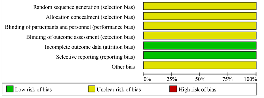 As shown in Figure 2, according to the quality assessment criteria (the Cochrane Collaboration’s for Assessing Risk of Bias from the Cochrane Handbook for Systematic Review Interventions) [32] , the majority of the six RCTs were consi-