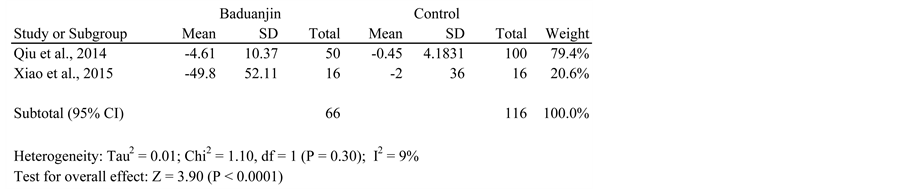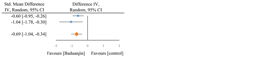 Two RCTs (a total of participants = 182) reported aerobic endurance [24] [33] . Meta-analyses were performed to compare the Taichi softball program with non-intervention controls [24] , Baduanjin (one of the Chinese traditional health-promoting exercises) and non-intervention controls [33] . The overall results of these studies suggest that Taichi softball is associated with significantly improved aerobic endurance performance (SMD = −0.69, 95% CI [−1.04, −0.34], P value of 0.30 for heterogeneity with I2 = 9%, P value of test for overall effect < 0.0001; Figure 4).