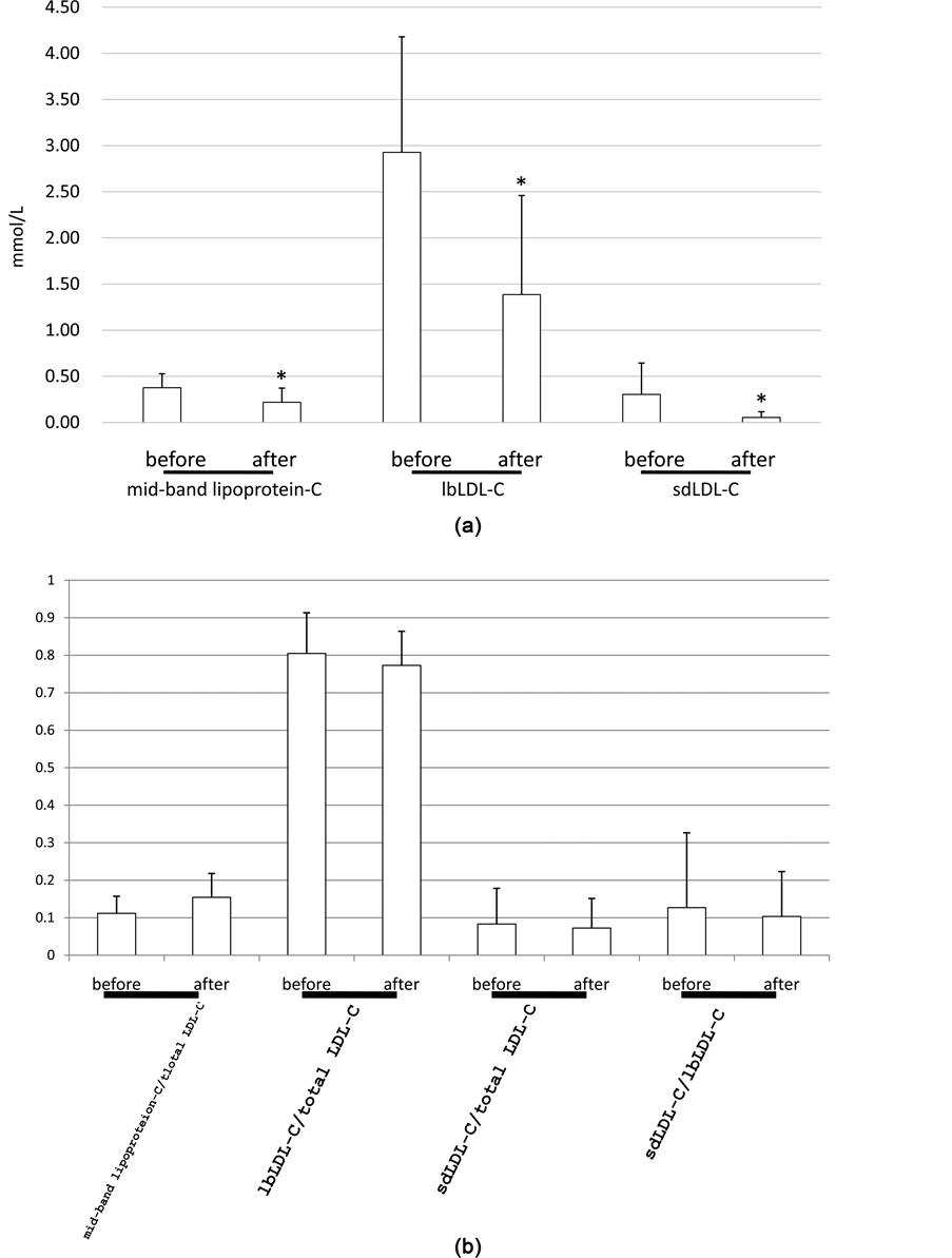 Figure 9. (a) Change of LDL-C, lipoprotein LDL-C, lbLDL-C, and sdLDL-C levels and (b) change of the sdLDL-C/total LDL-C ratio, lbLDL-C/total LDL-C ratio, mid-band lipoprotein-C/total LDL-C ratio, and sdLDL-C/lbLDL-C ratio before and after the add-on therapy of 140 mg evolocumab (n = 30). The sdLDL-C, lbLDL-C, and mid-band lipoprotein-C levels were respectively reduced by 90%, 47%, and 36%. The sdLDL-C/total LDL-C ratio, lbLDL-C/total LDL-C ratio, and sdLDL-C/lbLDL-C ratio were improved after evolocumab treatment, respectively, while the mid-band lipoprotein-C/total LDL-C ratio were not improved. All values are mean ± standard deviations. Abbreviations: LDL, low-density lipoprotein; lbLDL, large buoyant LDL; sdLDL, small dense LDL.