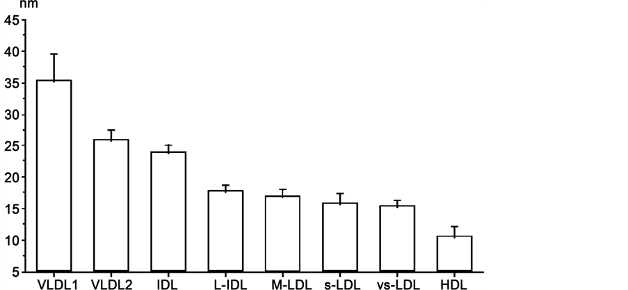 Figure 10. Size of the extracted VLDL1, VLDL2, IDL, L-LDL, M-LDL, s-LDL, vs-LDL and HDL particles. Size distribution of the extracted lipoprotein particles were examined by transmission electron microscope. The representative result indicated that the main diameters (nm) of VLDL1, VLDL2, IDL, L-LDL, M-LDL, s-LDL, vs-LDL, and HDL were 35.4, 25.9, 23.9, 17.9, 17.0, 15.9, 15.4, and 10.6, respectively. Values are the mean ± standard deviation. Abbreviations: VLDL, very low-density lipoprotein; IDL, intermediate- density lipoprotein; L-LDL, large size LDL; M-LDL, medium size LDL; s-LDL, small size LDL; vs-LDL, very small size LDL.