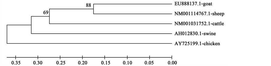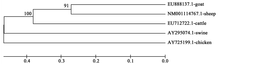 The dendrograms were constructed to compare the common ancestral nucleotide and amino acid sequences of the species since each tree may give a useful information for proper understanding of the evolutionary relationships. The phylogenetic tree revealed that clustering was species wise with some level of intermingling between species. This is an evidence of trans-species evolution which might be attributed to the coding nature of the sequences. The UPGMA consensus trees based on nucleotide and amino acid sequences revealed that goat, sheep and cattle were closer followed by swine while chicken was farther apart. This is in accordance with classical classification as goat, sheep and cattle are members of the bovidae family, and swine shares the order artiodactyla with the ruminants. The findings of this study also agrees with the submissions of Misra et al. [32] and Ugbo et al. [33] who observed similar clustering of members of the bovidae family and order artiodactyla [2] .