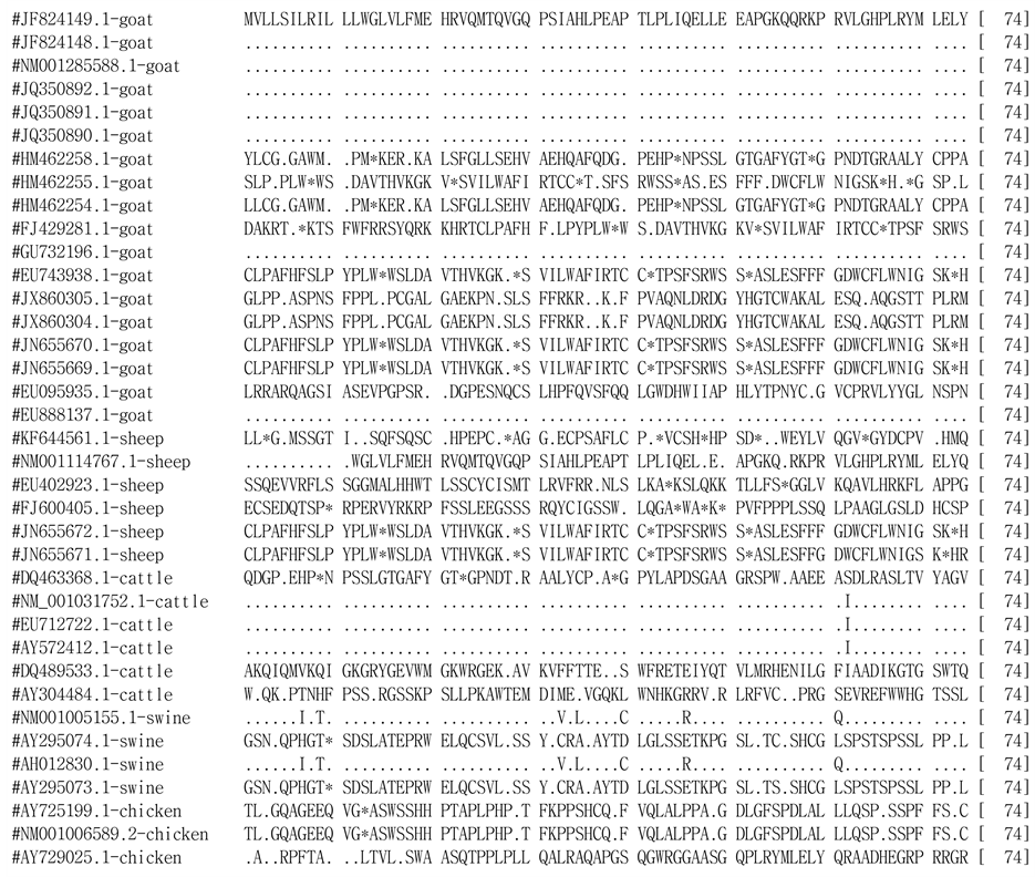 Table 2. Mean number of nucleotide substitutions per synonymous site (dS) and per nonsynonymous site (dN) with their ratio among goats, sheep, cattle, swine and chicken.