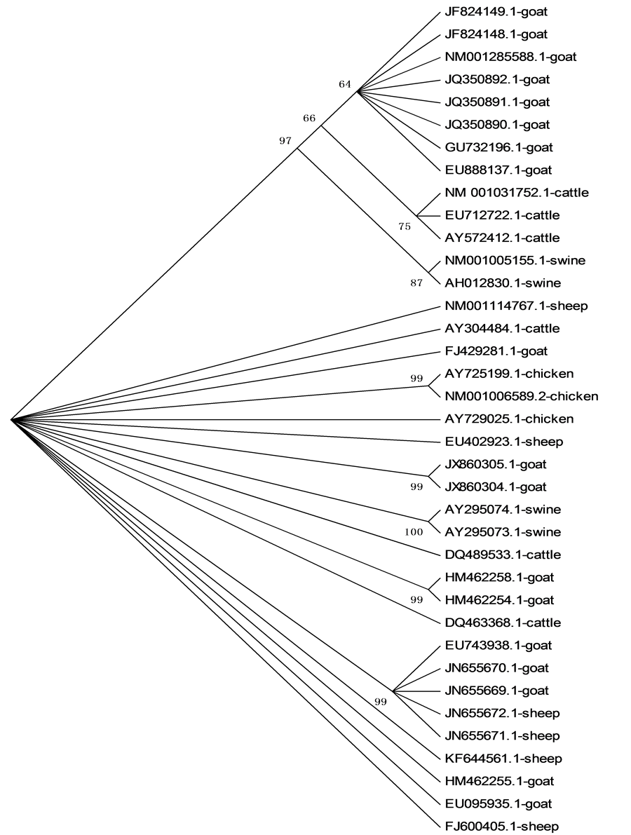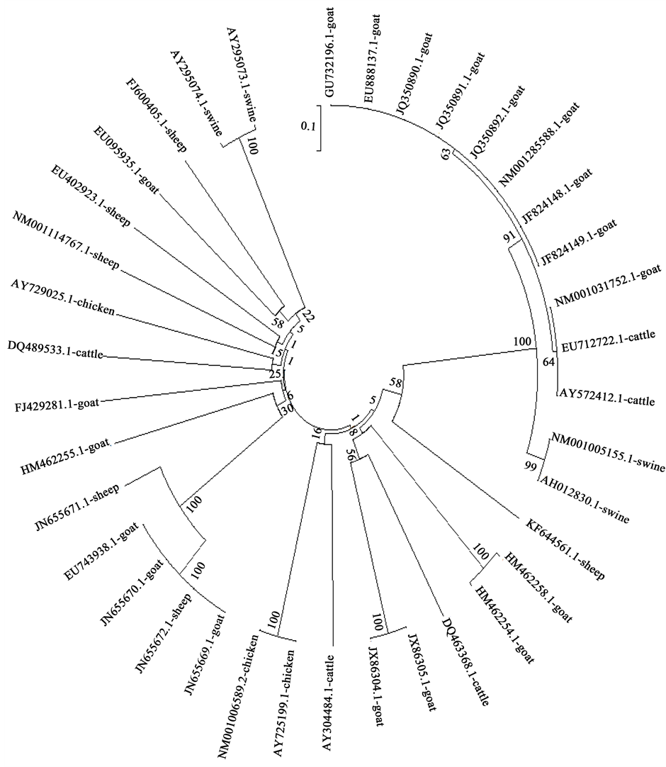 Figure 2. Phylogenetic relationships of goast, sheep, cattle, swine and chicken BMP15 nucleotide sequences.