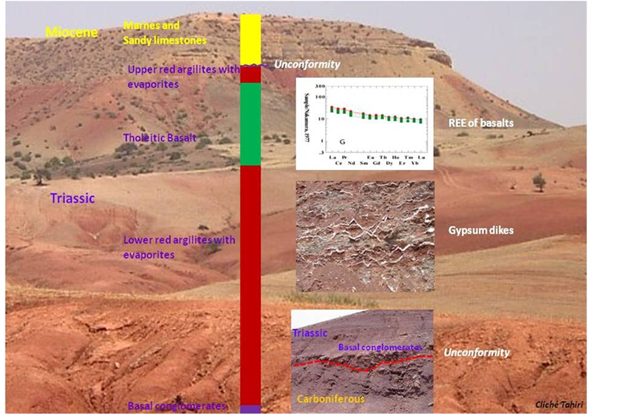 This typical Triassic series which lies uncomfortably on the lower Visean conglomerates is made up of gypsiferous clay deposits including lower argillite (sandstone at the bottom) separated by one greenish color―basaltic lavas flow (or more?) from upper argillite [19] -[21] . The assignment of Upper Triassic age (Carnian) to sedimentary rocks is achieved by palynological determinations [22] . In this basin, the thickness of the basalt flow (s) (interposed between the lower and upper shales) is variable (20 to 100 meters) [19] [20] . Local presence (north and west of Rommani) of pillow lavas structures [19] [20] suggests a marine environment setting probably subaerial. The flows are altered and contain large pods of secondary calcite. These lavas are considered as a part of the wide Central Atlantic Magmatic Province (CAMP) [23] [24] .