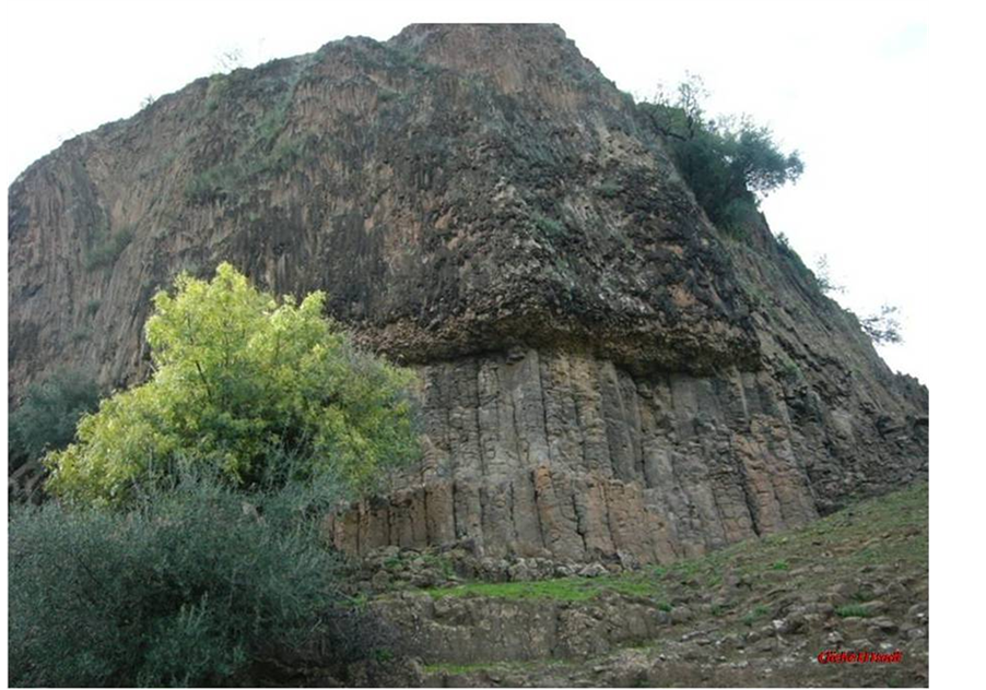 These lavas form sometimes spectacular landscapes, as that of Oued Boulahmayel where we can appreciate the superposition of two lava flows, one from above which is massive formed of tephrite and that from below in pretty prisms composed of melanocratic nephelinite