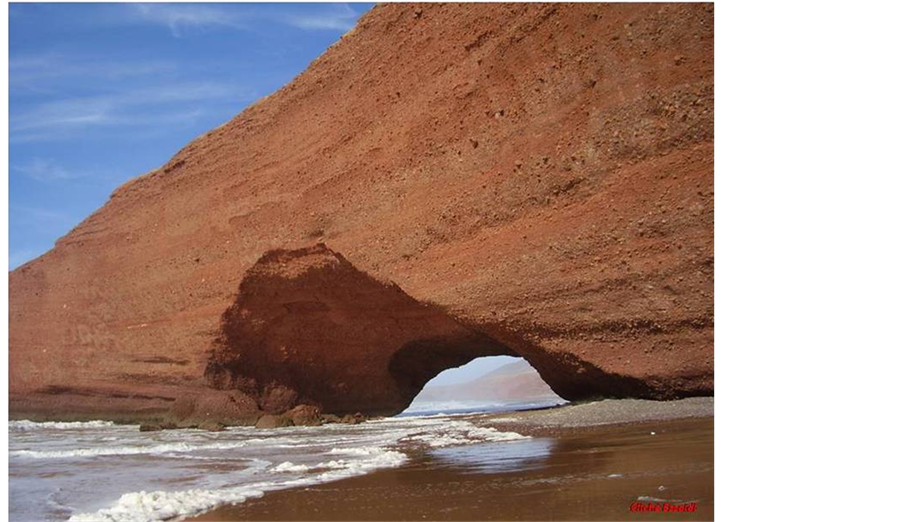 strange natural and unique complex began around 110 million years. At this time, the region was occupied by torrential and fluvial systems whose conglomerate and sandstone deposits are witnesses. The sediment load consists essentially of clays, grains, granules and pebbles. This heterometric and polygenic sediment is discharged in large part in a subaerial environment and probably ends in low layer of water to form a fan-delta. Facies mostly lenticular structures reveal various “sheet-flow” oblique bedding, crossbedding and residual deposits (lag deposits) while the coarse clasts (1 - 8 cm diameter) are relatively angular and poorly sorted. The granitic and volcanic nature of the elements reflects the erosion of neighboring reliefs composed mainly by Proterozoic bodies of Ifni inlier. Constantly attacked by waves and occasionally storms, this complex was transformed over time into a strange and attractive landscape by its shape and red ochre color. These natural arches of Mirleft certainly attractive are so fragile that their protection is needed.