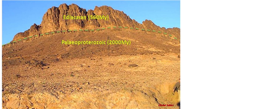 The Paleoproterozoic (Referred as PI on geological maps) is represented by eburnean porphyritic monzo- syenogranite of Tazenakht (orthogneiss) dated to 2O30 Ma (SHRIMP U-Pb on zircons [13] ) and forms part of what is known as the West African Craton. The top series includes highly potassic calc-alkaline volcano-clastic deposits (Conglomerate, ignimbritic rhyolite, trachytes, andesites, basaltic trachyandesites, tuffites and levels of Stromatolites) of Ediacaran age (Referred as PIII or Ouarzazate series on geological maps) (Figure 3).