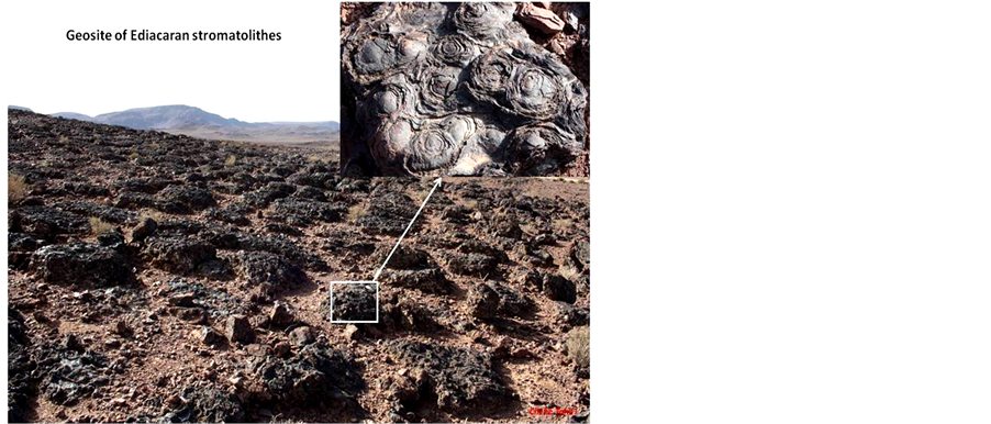 They are located in the Anti-Atlas, 20 Km southern the city of Ouarzazate, on the road leading to Agdez. Stromatolites (or Conophyton Collenia sl), which correspond to silicified algal constructions, are primitive freshwater organisms indicators of early life index. They are located in a lacustrine and silicified limestone layer interbedded in the middle of the Ediacaran volcanic and volcano-clastic series of which has been dated to 571 ± 8 Ma (SHRIMP U-Pb on zircons) [13] (Series of Ouarzazate, as Referred PIII).