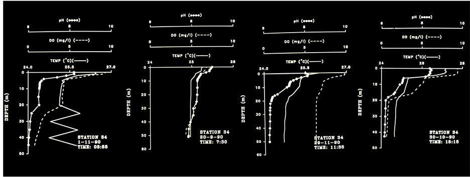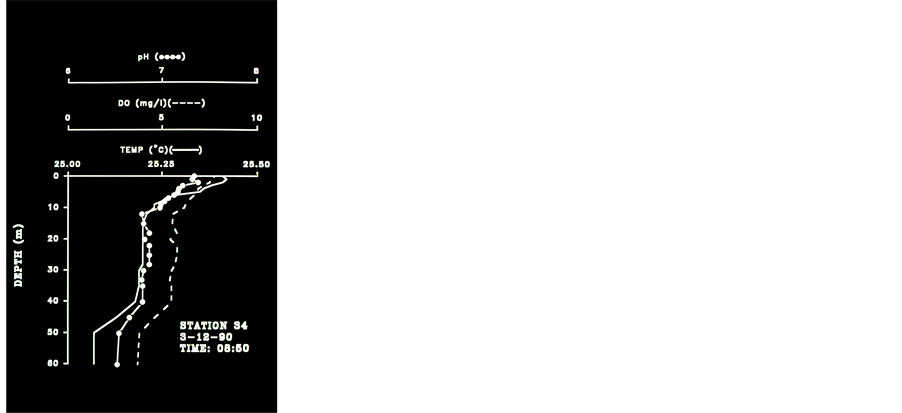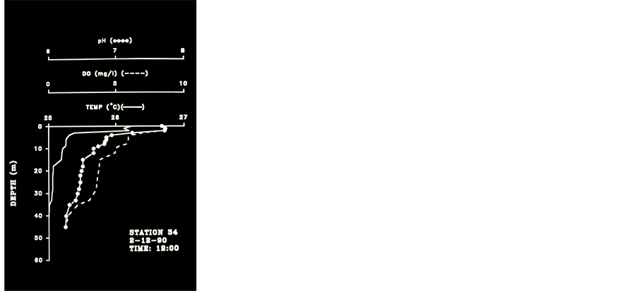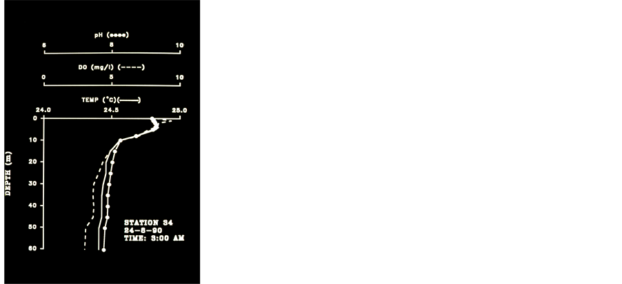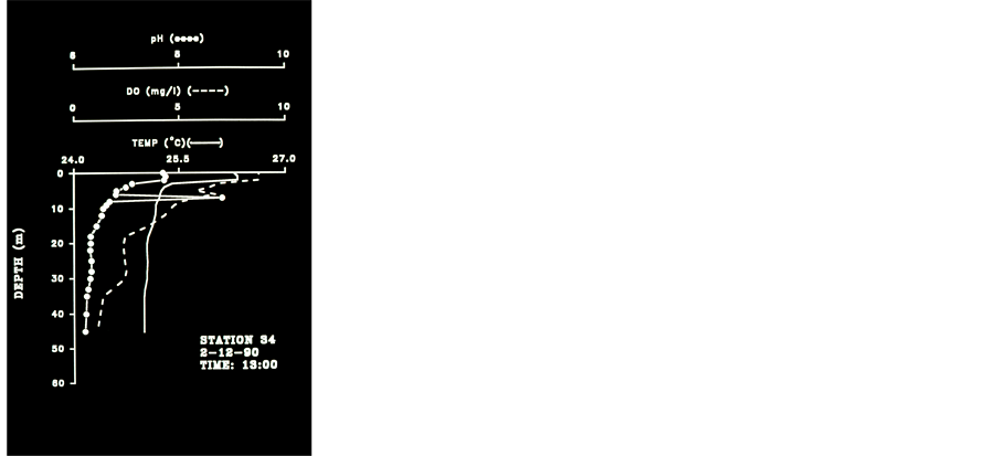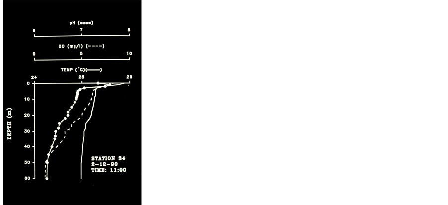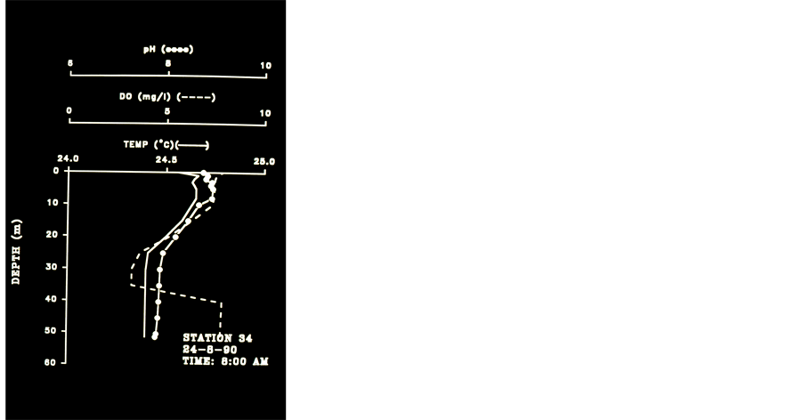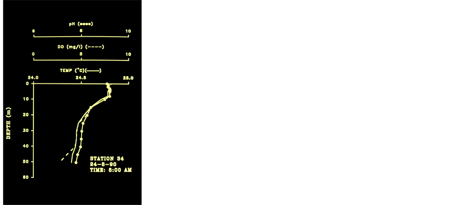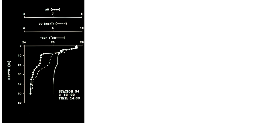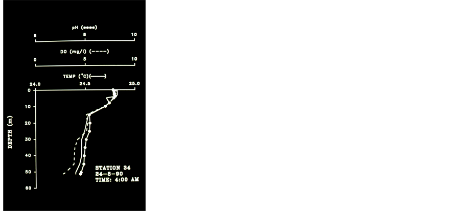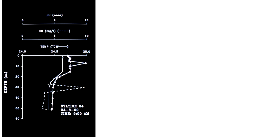 Results in Table 6 show the followings: 1) Higher DO concentration in upper layer during the 1990’s probably due to increase of phytoplankton biomass; 2) Lower DO concentration (enhancement of anoxia) in deep layer during the 1990’s, excluding April, May, July. The increase of photosynthetic activity in upper layer during the 1990’s is also expressed by the higher % of saturation. A verification of the anoxic enhancement and the close relation between DO and pH in Lake Victoria are presented in Table 6 and in Figures 3-8. The formation of a thermocline at 5 m depth during 10:00 am and its decline to 10 m as expressed by Temperature, DO and pH at 15:00 pm. In late afternoon (17:00 - 18:00) thermocline decline to 20 meters was indicated together with anoxia (<4.0 ppm DO) below 20 m . The four profiles measured at station 34 during 08:55 - 15:15 which are presented in Figure 4 indicates thermocline located at 5 m and anoxia (<4.0 ppm) accompanied by low pH (<7.0) below 20 meters during day time. The five profiles given in Figure 5 represents thermal changes during morning time in station 34. Thermocline formation at 10 m during 03:00 followed by a decline to 15 m and evaluated to 9m one hour later and almost a complete destruction of stratification later at 05:00. During late morning a