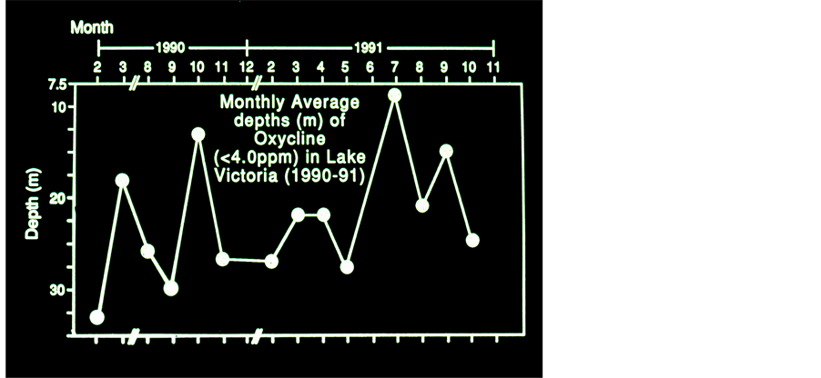The RTR value for Lake Kinneret (Israel) (mean Epilimnetic and Hypolimnetic Temperatures-26˚C and 15˚C respectively converted to density units) is 290. Consequently, stratification stability in Lake Kinneret is much stronger than in Lake Victoria [21] . The low stability of stratification in Lake Victoria is therefore acting as a significant factor of nutrient input through an effective upwelling and mixing processes [19] [21] . It is an efficient bottom-up eco-force contributing nutrients for phytoplankton growth. A Monthly averages of DO concentration (ppm) and % saturation in two layers (0 - 20 m ; 40 - 60 m ) in the Kenyan waters of Lake Victoria during the 19601’s [18] [20] and 1990’s are given in Table 6.
