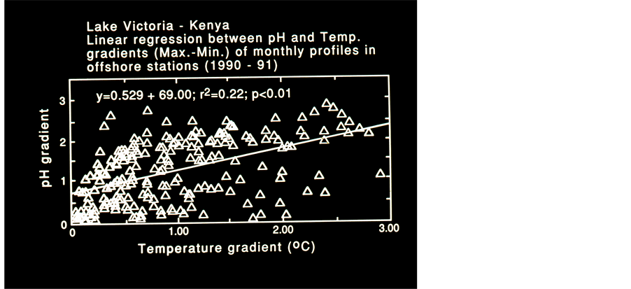 between the density of “A” minus the density of “S” in relation to the density difference of 4˚C and 5˚C. The higher the result is the higher is the stratification stability, i.e. more energy is required for mixing. A significant indicator of the strong mixing activity within the water column of the offshore zone of lake Victoria is also presented by the pH values uniformity, ranged between 6.91 - 7.55 (one exception of 8.02). The significant relations as presented by linear regressions between the minimal temperatures and pH values as well as between the thermal ranges and pH values indicates the following situation: There are two independent processes: 1) Photosynthesis resulting DO production and pH decline, and 2) Thermal changes. Solar radiation is the only heat source (air temperature) and its distribution downwards is depend upon water heat conductivity. The DO production and pH decline is primarily induced by phytoplankton which is homogenously distributed in upper layers resulting insignificant regression with temperature. In deep waters where light is limited and phytoplankton biomass is lower and consequently photosynthesis, DO production and pH decline and simultaneously fluctuate with thermal changes, and therefore the two processes (thermal and pH fluctuations) are significantly related. The significant relations between pH and thermal ranges reflect the dominant impact of the low temperatures in deep layers. Consequently, thermal ranges in profiles without anoxia are smaller than those with anoxic (and