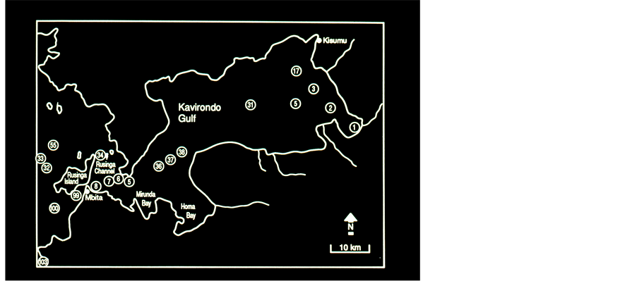 Figure 2. The Kenyan Part of Lake Victoria Kavirondo, (Wynam) Gulf Sampling Stations are numbered.