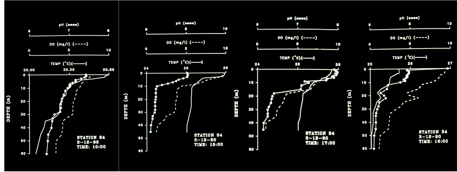Figure 5. Temperature, pH and DO Profiles Station 34, 24.8.90, 03:00 am - 08:00 pm.