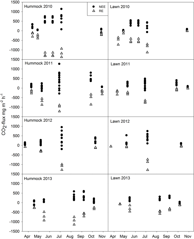 Figure 4. Measured instantaneous CO2 exchange (NEE and RE) of the microtopographical habitats (hummocks and lawns) during 2010-2013.