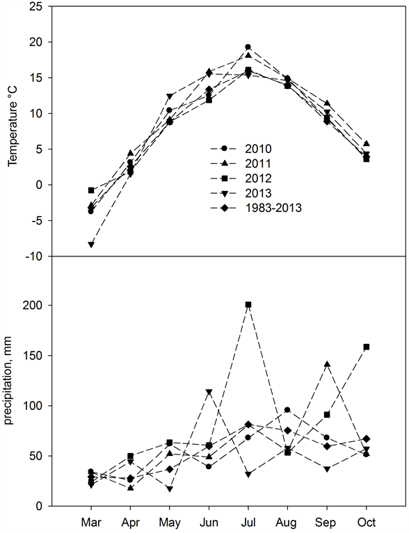 Figure 1. Mean air temperature and monthly precipitation at Kauhaneva from March to October during 2010-2013 and as 30-year average 1983-2013.