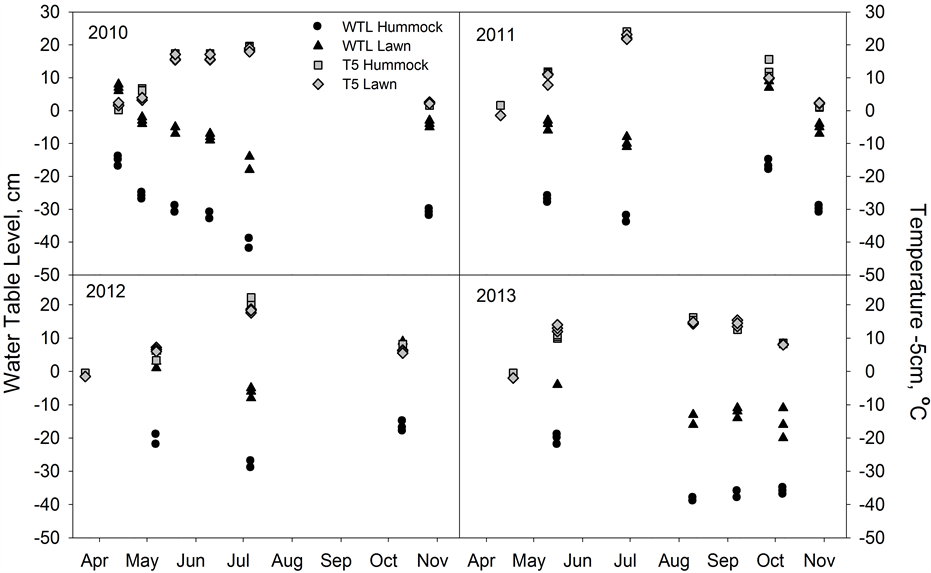 The timing of snowmelt varied rather slightly during the study period, occurring early April in all study years except 2012. Although the season of 2012 was the coldest during our study period 2010-2013, the snowmelt was, however, the earliest taking place in the middle of March in 2012. Short-term (ca. one month) inundation occurred immediately after snowmelt especially in spring 2010 on the lawn plots (Figure 2). The snow and/or inundation free period lasted for seven months covering the whole growing season for the hummocks, whereas only ca. six months for the lawns having the inundation after the snowmelt and delayed snowmelt compared to hummocks. In 2012, the difference between hummocks and lawns in the snow and/or inundation free period was almost one and a half months.