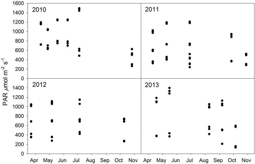 Figure 3. Measured photosynthetically active radiations (PAR) at Kauhaneva during 2010-2013. PAR values are based on manual measurements made in conjunction with CO2 exchange measurements. Part of the measurements was done under an artificial shade reducing the ambient light by 40% - 60% resulting the rather large variation in PARs.