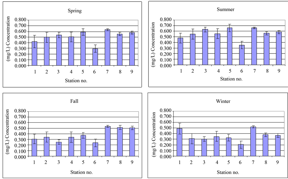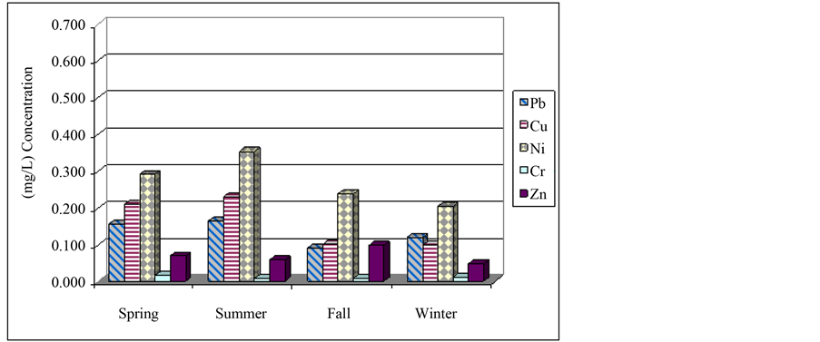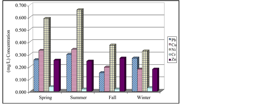 Process stages are as follows: first, we allow organic phase to evaporate in ambient temperature. Then, evaporation products are solved in 0.5 mL thick nitric acid and transferred to 25 mL volumetric flask and reaches volume using distilled water. Obtained solution can be kept in refrigerator. Method used for measuring intended metals is flame absorption spectrometry and it was performed by VARIAN SpectAA 220 model. Stages of experiment are in accordance with procedure 3110 of standard as well as instructions of the system [8] [9] . To calibrate system, standard solutions (tetrazolium) produced by Merck company was used. To statistically analyze data, Stat Graphics Plus 3.0 and to sketch diagrams, Microsoft Excel 2003 was used. To statistically analyze data, changes of investigated parameters in various stations and seasons were evaluated using one-way variance analysis and to investigate and study of the simultaneous effect of time and place on measured variables, two-way variance analysis was used. In cases in which difference is significant, to find the source of difference, Duncan multiple comparison method is used. Finally, to compare obtained results, standards of Iran environmental protection organization corresponding to wastewater sewage and reuse of wastes is used [10] .