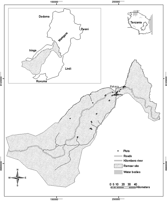 Figure 1. Location of the study area: Morogoro region of southern-central Tanzania with Kilombero Valley Floodplain wetland (top left), and the location of 60 study plots on the north-eastern side of the floodplain (down).