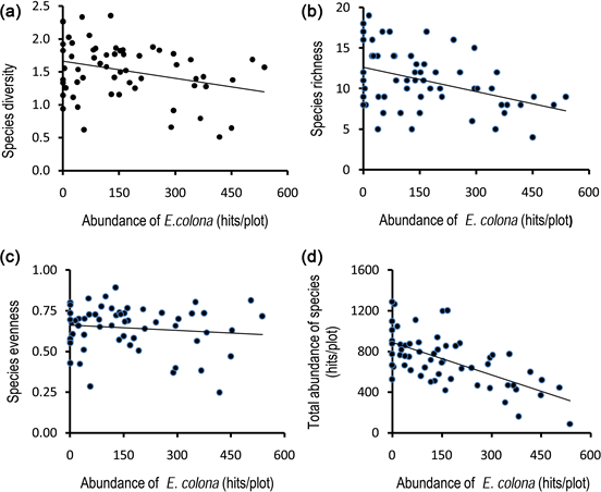 To establish the impacts of E. colona on community abundance, richness, evenness and diversity vegetation data from 20 quadrats were summed to obtain data for plots (n = 60). Similar approach was employed to assess the impacts of E. colona on richness and abundance of graminoid, forb and shrub functional groups. Thus, community abundance was the sum of abundances of individual species in 20 quadrats. Species richness (S), Shannon-Wiener diversity index (H'), evenness (E) and abundance were computed for each plot. To determine community species richness number of all species present in a plot was added. The Shannon diversity index was computed with BiodiversityR package following [21] and evenness as E = H'/ln S where S is the number of species in the plot [22] . It was not possible to compute evenness and diversity indices for all functional groups as shrub group had few individuals. Consequently, only species richness and abundance for functional groups were calculated. Functional group richness was the sum of different plant species recorded in each group (i.e. graminoid, forb and shrub) per plot. Similarly, functional group abundance was obtained by adding the abundances of individual species in respective groups per plot. Scatter plots were used to explore data trends for all dependent and independent variables before the actual analyses. Data for E. colona abundance was removed from data matrices before computation of functional group and community structure indices (i.e. abundance, richness, evenness and diversity). Generalized linear models (GLMs) were then used to examine the relationship between community species richness, evenness, Shannon diversity, total abundance, and the species richness and abundance of graminoid, forb and shrub functional groups, and E. colona abundance [23] . Because our response data sets had both count (e.g. number of shrub species) and continuous data (e.g. diversity of graminoid species), we ran GLMs with logarithmic link function and Poisson distribution for count data, and used GLMs with identity link function and normal distribution of errors for continuous data [23] . We used standard diagnostic plots to validate all final models. All the statistical analyses were done using R [24] .
