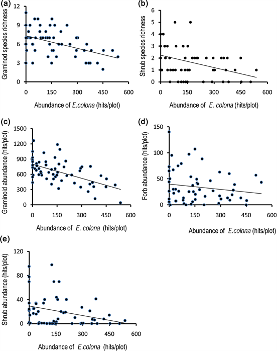 community richness, evenness, diversity and abundance) were negatively related to the abundance of E. colona at Kilombero wetland. The study also shows that there was a negative relationship between species richness of graminoids and shrubs and abundance of graminoids, forbs and shrubs, and E. colona abundance. The negative relationship between community and functional group attributes and E. colona abundance support the widespread evidence that alien species invasion exert significant negative impacts on resident plant communities [25] . The negative relationship between community (richness, evenness, diversity and abundance) and functional group (richness of graminoids and shrubs and abundance