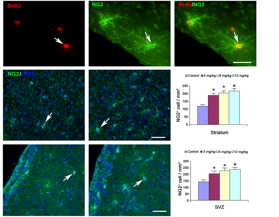 Figure 5. NG-2 staining (marker for proliferating OPCs) is increased in the striatum adjacent to the hematoma (middle center) and the ipsilateral SVZ (lower center) of the Tβ4-treated rats when compared to the saline control (middle left and lower left). Double staining (upper right) shows that BrdU-positive cells (upper left) are co-localized with NG-2 cells (upper center). Quantitative data (middle right and lower right) show significantly increased staining in the 3 mg/kg, 6 mg/kg, and 12 mg/kg of Tβ4-treated rats compared to the saline-treated control group. No significant difference is found between the different dose treatment groups.