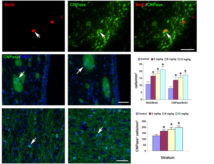 [29] , these data suggest that the OPCs labeled with BrdU continue to divide before differentiating into myelinating oligodendrocytes after Tβ4 treatment.