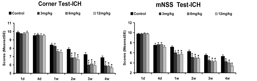 Functional outcome was assessed using a cornering test and mNSS at days 1, 4, 7, 14, 21 and 28 after ICH. The cornering test measures the number of times that an animal turns to the right or left when placed in a corner (the normal state being 50%) [27] . The mNSS-a composite of motor, sensory, balance, and reflex measures-is used to assess neurological functions using a 0 - 18 scale, with higher scores implying greater neurological injury [28] .