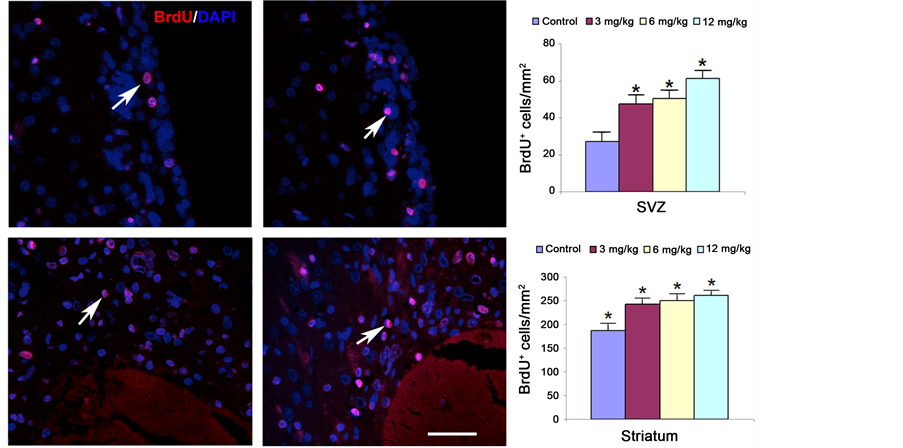 Figure 2. The effect of Tβ4 on BrdU-positive cell number in the ipsilateral SVZ (upper row) and peri-hematoma (lower row) after ICH. There are increased BrdU cells in the 3 mg/kg, 6 mg/kg, and 12 mg/kg (middle column) of Tβ4-treated rats compared to the saline control (left column) in both areas (right column). No significant difference is observed among the different dose treatment groups (right column).
