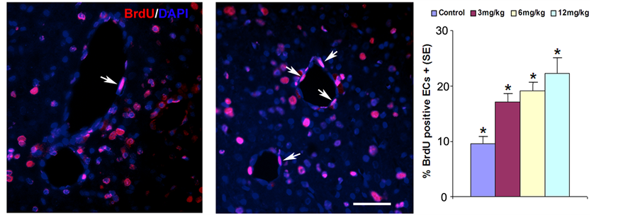 Figure 3. Vascular BrdU-positive endothelial cell (Ec) expression is increased in striatum (middle panel) of the Tβ4-treated rats when compared to saline control (left panel). Quantitative data (right panel) show significantly increased percentage of vascular endothelial cells compared to the saline control group.