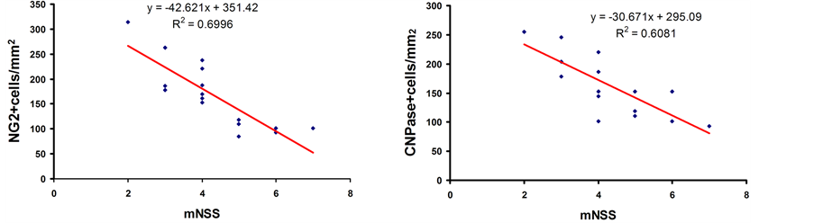 Figure 4. Correlation of functional recovery with proliferating OPCs and mature oligodendrocytes. The graph shows that the score of mNSS is significantly and inversely correlated with the number of NG2-positive and CNPase-positive signals at 4 weeks after ICH at the high-dose treatment group (p < 0.01).