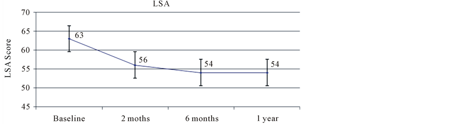 Figure 1. Changes in life space assessment (0 - 120) over 1 year in older women undergoing non-surgical treatment for urinary incontinence. p < 0.001 between baseline and 2 months, sustained to 1 year; Life space assessment range 0 - 120.