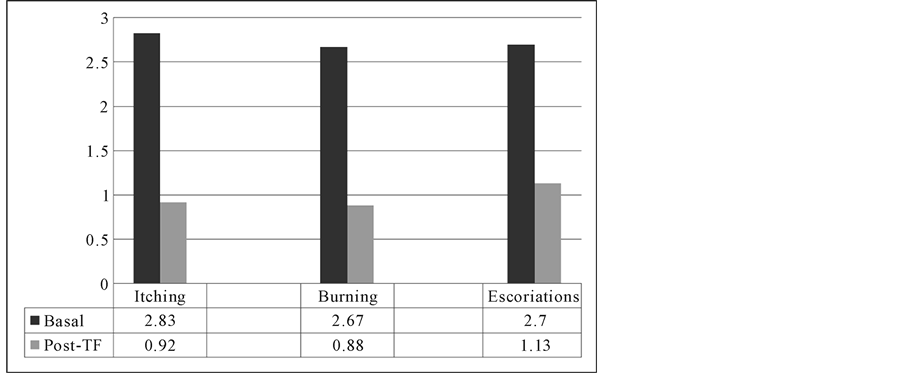 The characteristics of the study population are summarized in Table 1. The symptoms at the first consult were itching and burning in 19 (95%), 11 (55%) women respectively. In terms of the subjective outcome, as reported by the patients (itching and burning) there was a significant reduction of symptoms between the basal scores and the symptoms complaints at 4-week treatment (Figure 1). Moreover we observed a significant reduction of excoriations and linear fissures after the treatment. During the entire study no drop out related to the topical treatments was observed; only two patients experienced a mild transient burning after TF application.