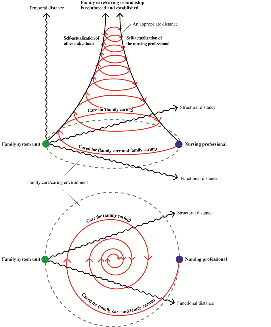 Family care/caring forms the basic principle of family nursing, and is essential for the family system unit to maintain and improve family functioning independently and autonomously. In the family care/caring environment, which is within the family environment, the family system unit is cared for by the nursing professional, and conversely the family system unit cares for the nursing professional. The respective actions are deployed in a circular transaction (mutual act). Looking at the two-dimensional plane formed by the structural distance and functional distance, family caring forms a concentric circular structure and through these transactions, the structural distance and functional distance between the nursing professional and family system unit gradually move closer, maintaining an appropriate distance through deepening of mutual trust. Moreover observing the three- dimensional space-time continuum which is created through addition of the temporal distance, family caring forms a helical structure. As transactions are repeated along the temporal axis, the family system unit’s self-ac- tualization of other individuals, and the self-actualization of the nursing professional, are realized. Through these processes, a family care/caring relationship is reinforced and established.