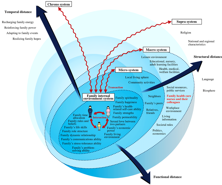 The Concentric Sphere Family Environment Theory (CSFET) proposed by Hohashi [7] is a middle-range family nursing theory that focuses on the family environment that acts on the well-being of the family system unit. The family environment consists of “all entities (people, objects and matters) and phenomena that exist both within and outside the family system unit.” The CSFET takes the form of a three-dimensional logical space-time continuum, consisting of three assessment axes (structural distance, functional distance, and temporal distance). Within these, the positioning of five systems (supra system, macro system, micro system, family internal environment system, and chrono system) enables the family system unit to be viewed in its entirety as a three-dimensional figure.