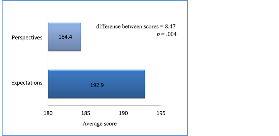 Before receiving care users had an expectation of 192.96 points. Considering that the highest score that can be obtained by applying the scale SERVQUAL is 196 points, we can assume that the expectation was high. However, after receiving the service perspective score was 184.49 points, indicating that the care provided was not that they expected. Difference between scores was 8.47 points (p = 0.004) (Figure 2).