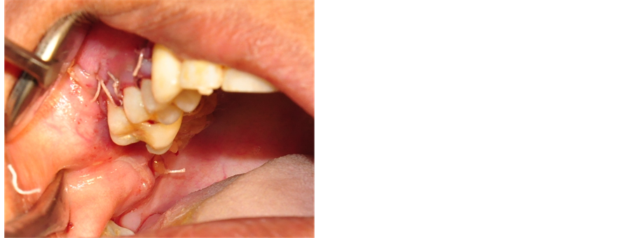 The buccal pad flap has been used for a variety of purposes, owing to its physical and biological properties, and the results have encouraged clinicians to make use of its potential benefits. The most common use of the buccal pad flap has been in the closure of big posterior oroantral communications, followed by post excision reconstruction. The rich blood supply may explain the high success rate. It also may be one reason for the quick epithelialization of the fat. Fujimura [3] et al. showed that BFP started to epithelialize in a week and completed its epithelialization within 6 weeks. Most authors agreed on the surgical technique to expose the BFP, similar to the one we performed. The alternative ways to close an oroantral communication includes laser bio-stimulation (over 5 days), transplantation of a mature third molar (followed by RCT of the tooth 5 - 6 weeks later), autogenous monocortical bone blocks (from the chin). Stajcis [4] advocated the use of the buccal fat pad for OAF closure without any complications, and we found that BFP was very useful for OAF closure without any disturbance and scaring in the vestibule of OAF closure such as buccal advancement flap.