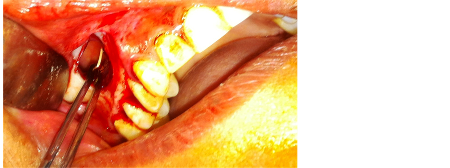 Right maxillary sinus was approached through the canine fossa by using the Caldwell-Luc approach, the procedure was performed under local anesthesia where an incision was made in the buccal sulcus from the lateral incisor to the first molar.