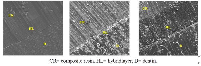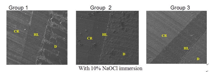 The SEM analysis result on Figure 1 On the Group 2 showed thin hybrid layer before and after 10% NaOCl immersion. On Group 1 and Group 3 showed thick hybrid layer, while hybrid layer in Group 3 after 10% NaOCl immersion to increase.