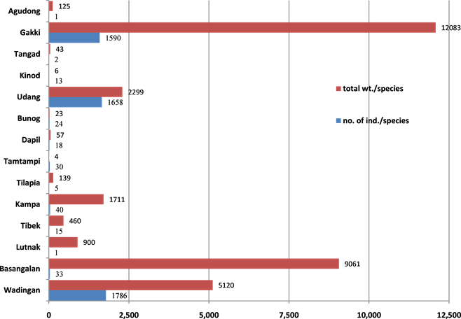In terms of weight, “gakki” has the highest volume of catch at 12.083 kg followed by “basangalan” and “wadingan” with values of 9.061 kg and 5.120 kg, respectively as shown in Figure 16. The high population of “gakki” with higher weight compared to “wadingan” surpassed the total biomass contribution of the latter from the total catch. This case is also the same with bigger size species such as the “basangalan”. Though, there were only few quantities that were caught because the peak season of this species is during the rainy months of the year.