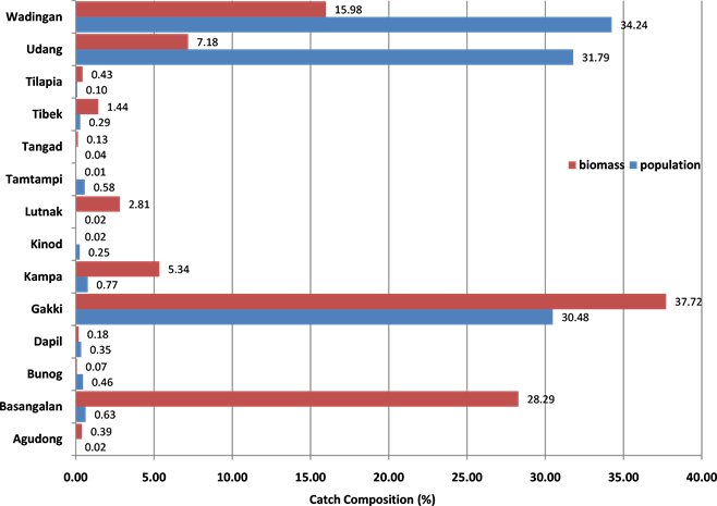 Figure 17 shows that “wadingan” (34.24%), “udang” (31.79%) and “gakki” (30.48%) comprise the highest number of individuals from the conducted study. The alarming proliferation of “gakki” is threatening the populations of smaller stocks such as “wadingan”, “bunog”, “dapil and other prawn species available in the ecosystem.