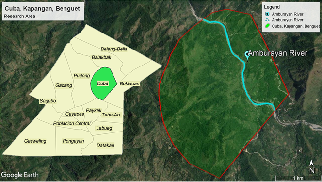 Figure 1. Location of the study site in Amburayan River in Cuba, Kapangan, Benguet (Source: Google Earth Pro and Quantum GIS).