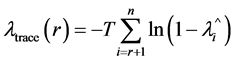 is the residual term, as in Enders [24] . The Johansen approach provides two alternate test statistics to examine cointegration: the Trace Test and the Maximum Eigenvalue Test. Under the Trace test, the null hypothesis is there is no cointegrating vector